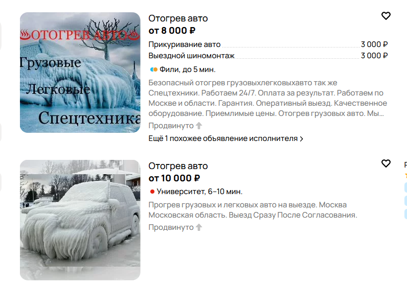 В Уфе мастер может приехать на место с оборудованием, чтобы прогреть двигатель, топливную систему или оживить аккумулятор. Согласно данным объявлений, базовая стоимость такой услуги начинается от 2,5 тысяч рублей, достигая в отдельных случаях 4 тысяч.