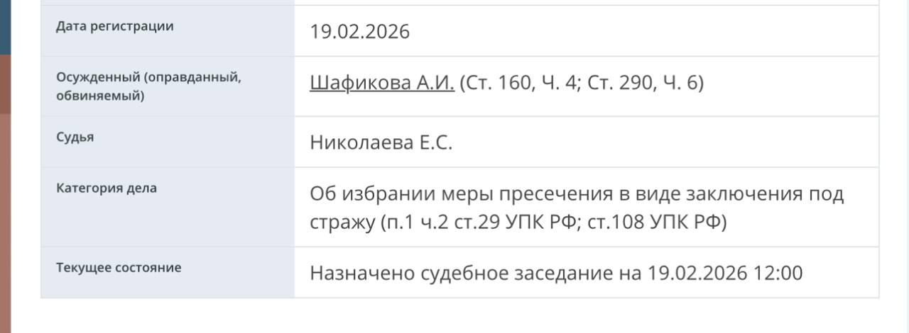 19 февраля 2026 года в Басманном районном суде Москвы началось заседание по избранию меры пресечения для Амины Шафиковой, занимавшей ранее пост министра культуры Башкирии.