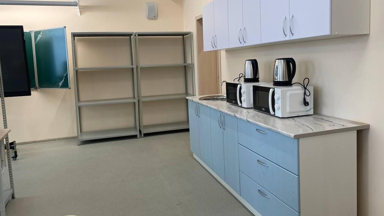 «Просторные коридоры и центральный холл, два современных спортивных зала, большой актовый зал, мастерские трудового обучения и кабинет домоводства, библиотека, музейный центр, в учебных кабинетах установлена современная мебель, смонтировано оборудование»