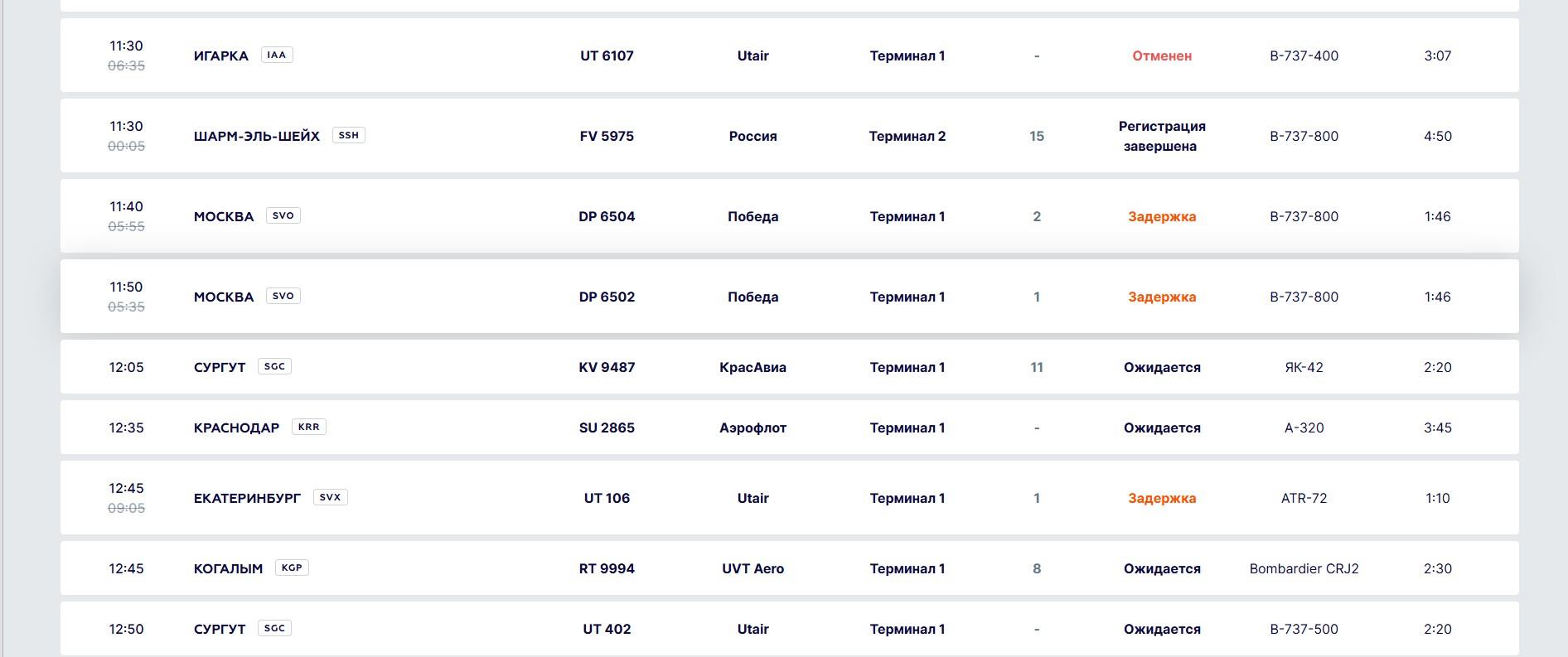 Актуальную информацию о вылетах можно найти на онлайн-табло.