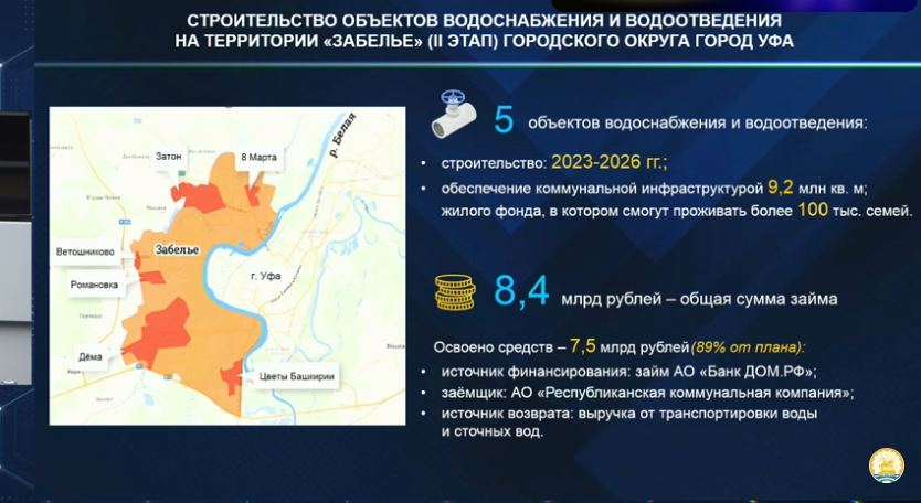 Эти средства направят на организацию водоснабжения, водоотведения и электроснабжения. По оценкам мэрии, только на первом этапе частные инвестиции застройщиков превысят 16 миллиардов рублей. Прокладка водопровода, запланированная до 2030 года, обеспечит ввод дополнительных 1,3 миллиона квадратных метров жилья в Зауфимье и улучшит условия жизни для 56 тысяч нынешних жителей района.