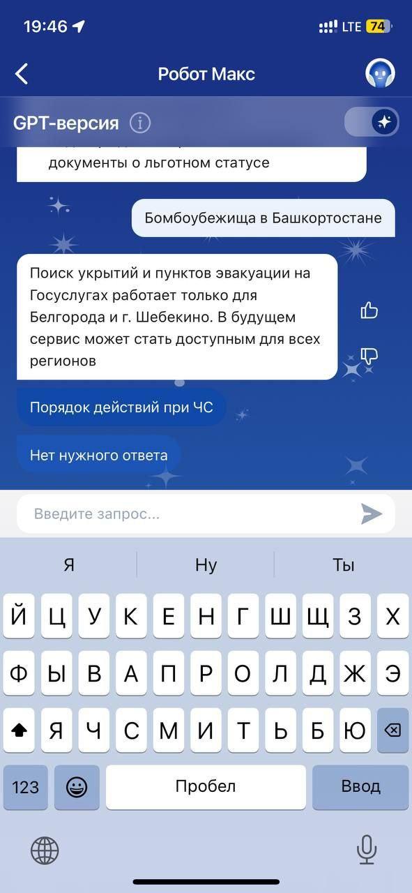 В ответ на соответствующий запрос бот «Госуслуг» сообщает, что интерактивная карта укрытий функционирует только для жителей Белгорода и Шебекино. Для других регионов, включая Башкирию, сервис «может стать доступен в будущем».