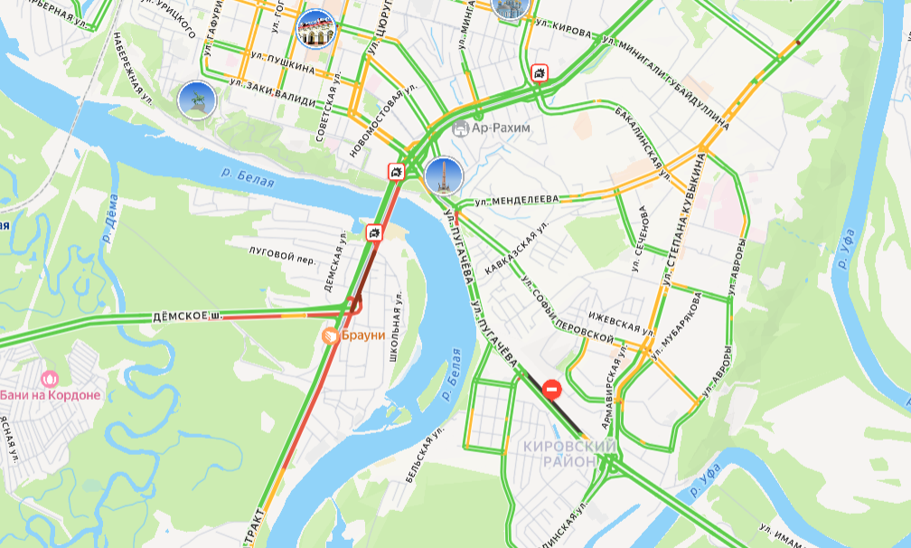 Согласно данным портала «Яндекс Пробки», общий уровень заторов в городе оценивается в три балла. Однако на въезде в город по мосту ситуация сложнее: полоса отмечена желтым цветом, а подходящий к нему Оренбургский тракт показывает красную зону протяженностью три километра.