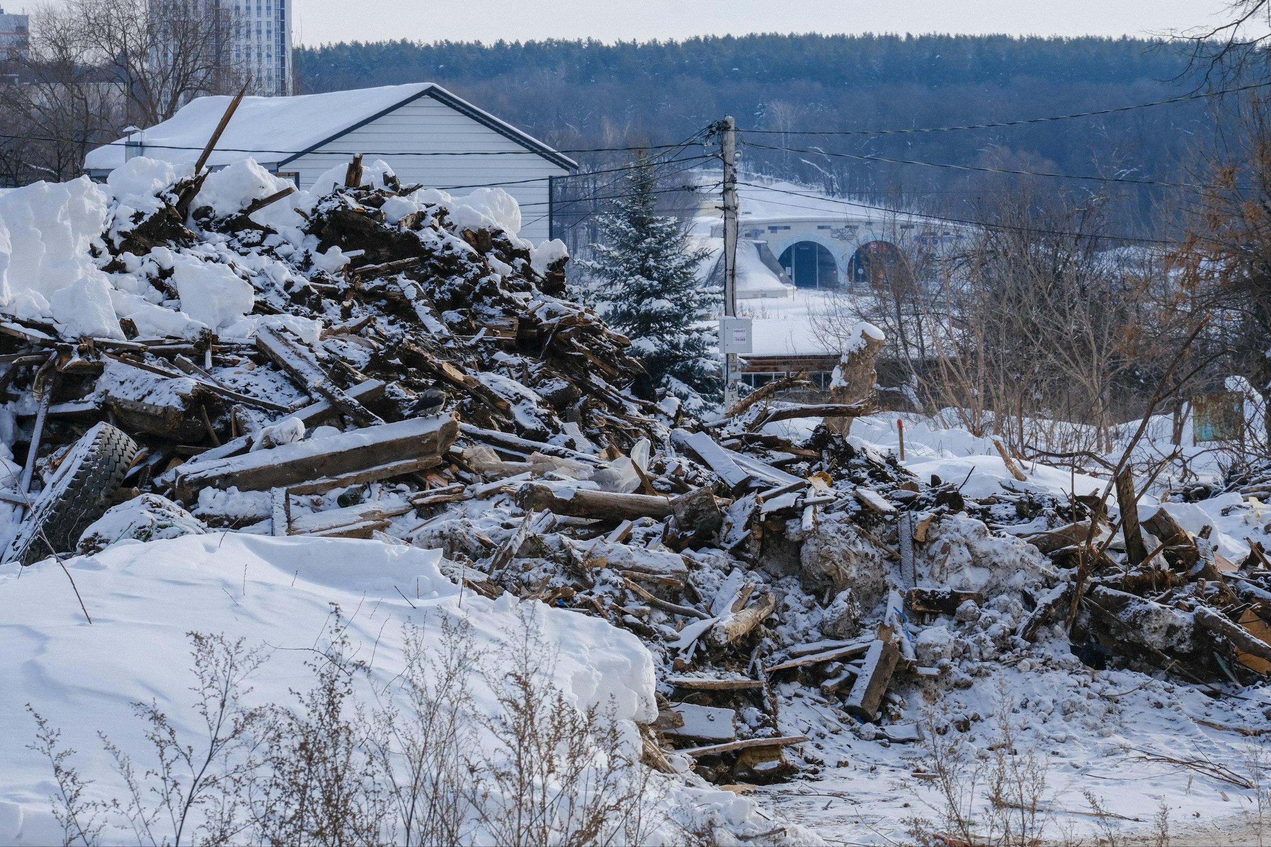 На строительной площадке остаются неубранные обломки снесённых зданий.